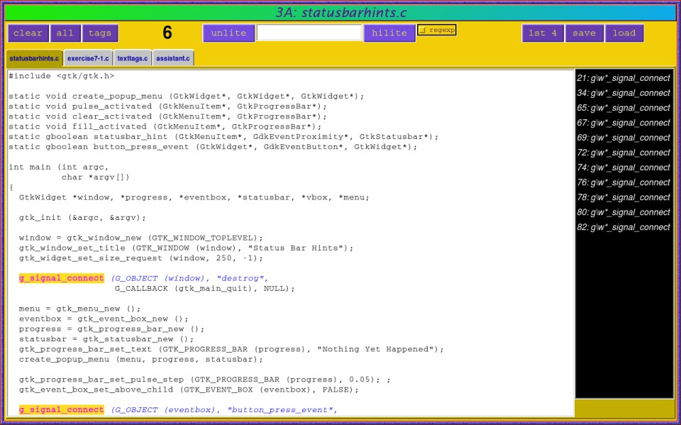 So it was g_signal_connect after all, and here's four different files with it highlighted and indexed, meaning I could see any of the examples in any file with two mouse clicks! Note that searches done this way (from the command window) are always regular expressions, so they will appear white in the index rather than the normal gray.